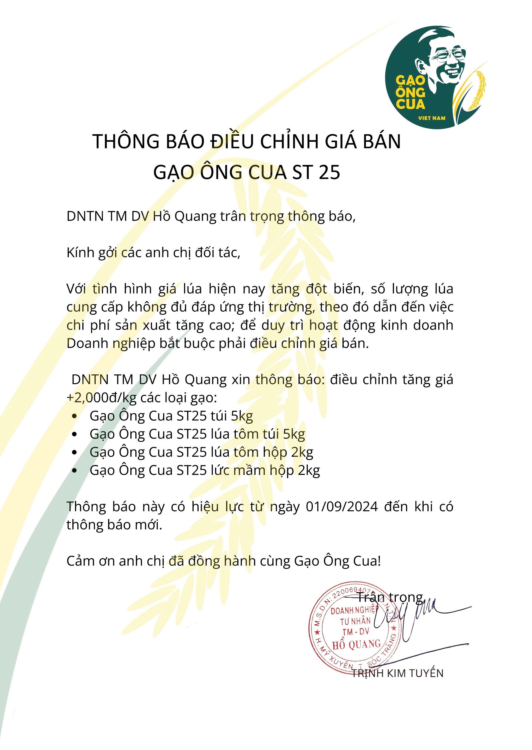 Thông báo điều chỉnh giá gạo Ông Cua từ 1/9/2024
